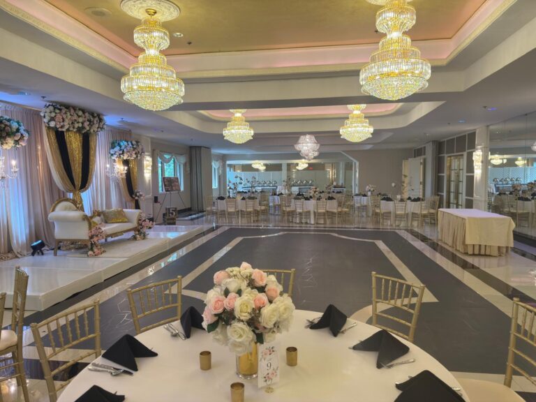 As you enter through our beautifully updated, landscaped driveway, you’ll be greeted by a vibrant flower-filled fountain and a charming gazebo—just a glimpse of the beauty that awaits inside. Step through stunning leaded glass doors into our revamped marble-floored reception area, where you’ll enjoy breathtaking views of the grand ballroom and its newly enhanced terrace.